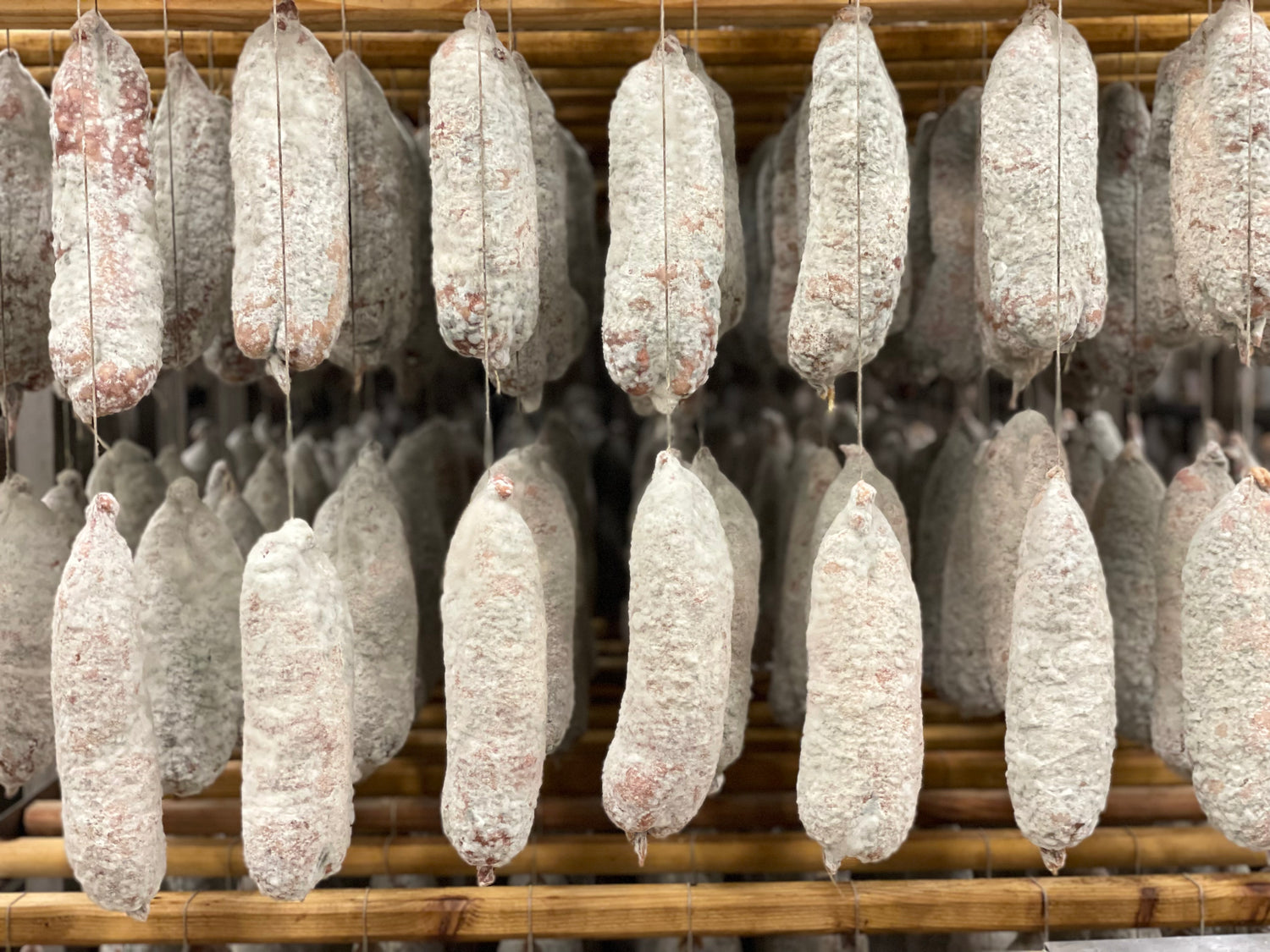 La Maison Montalet, located in Lacaune, stands out with its unique terroir. Lacaune is a small village in the Tarn, nestled in a slight basin at an altitude of 800 meters. It's a perfect place that benefits from three different winds (Mediterranean, Pyrenees, and Atlantic). That's why they have chosen natural aging, playing around with the different winds coming into the drying rooms. It's a choice that values craftsmanship and taste. In addition to handcrafting charcuterie using natural casings, this naturally cool cellar, heated with wood during winter, perfectly reflects the traditional know-how. It's a true success for refining Montalet’s charcuterie, which embodies the distinct character of their terroir.